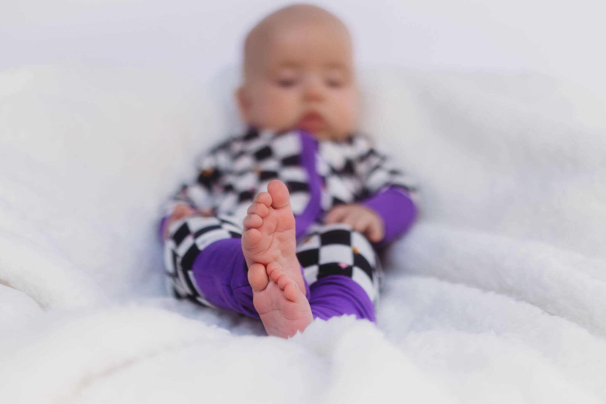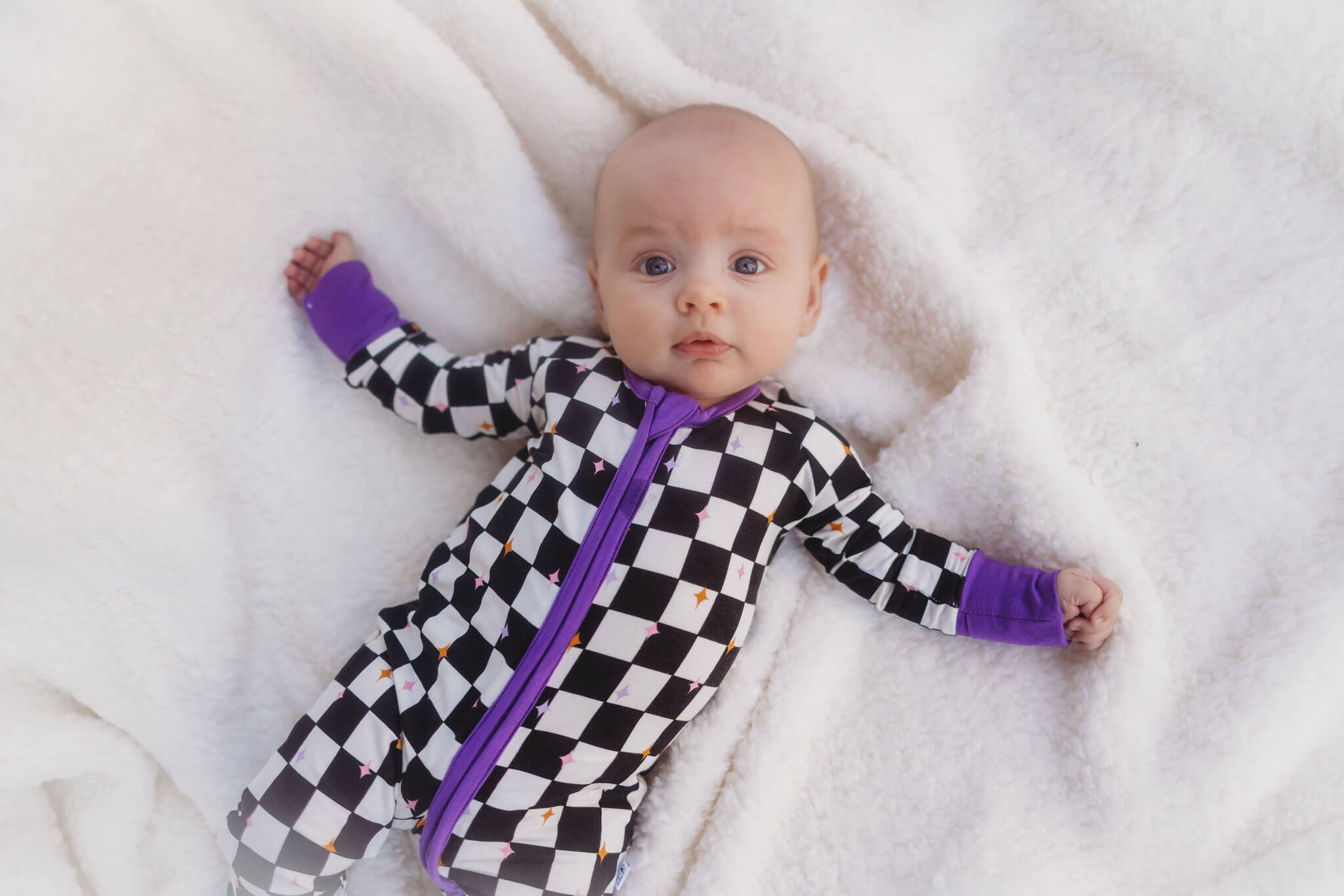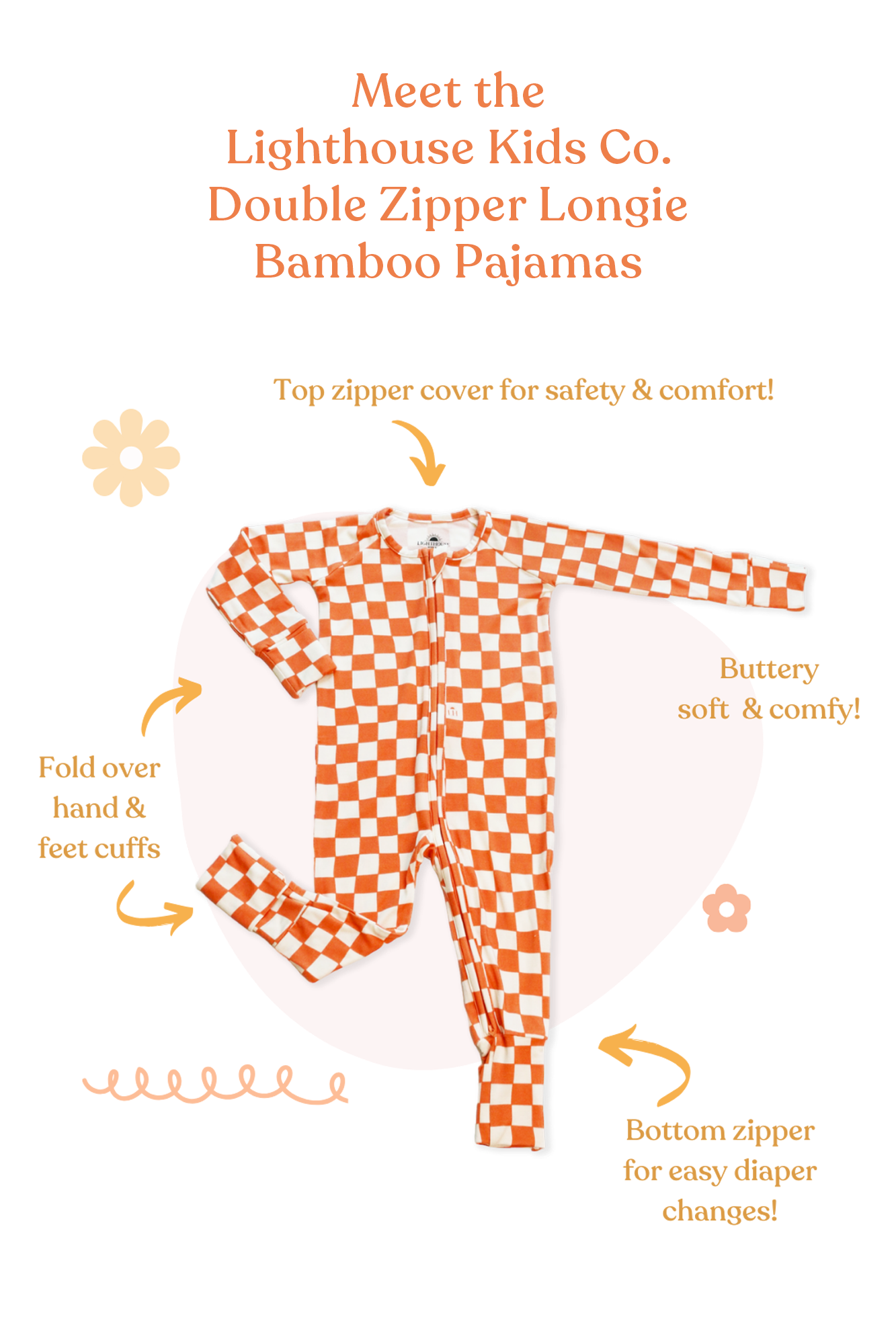 The Lighthouse Kids Company Baby Bamboo Pajamas in Checkers is a one-piece pajama. Buttery soft and stretchy, our zipper pajamas feature fold-over feet and mittens, tagless, with two zippers so you can change baby easily.