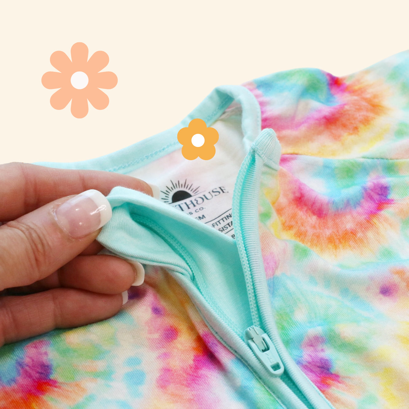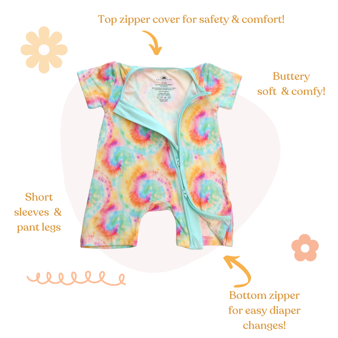 The Lighthouse Kids Company Baby Bamboo Pajamas in Tie-Dye is a short one-piece pajama.ย Buttery soft and stretchy,ย our zipper pajamas are tagless, with two zippers so you can change baby easily.
